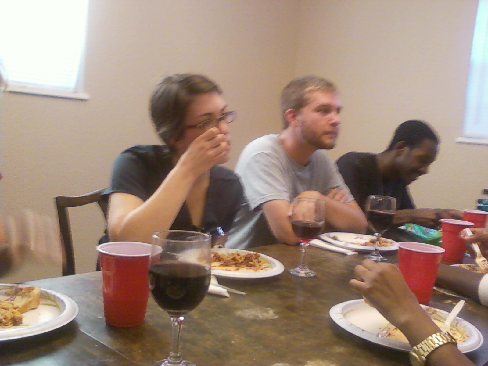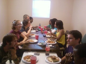 Meals matter. My Jesus community shares meals together often. You see, we didn’t set out to throw a party on Tuesday. The four of us currently living at together planned to eat dinner together, and then the women got themselves invited. And then, as Eric and I were shopping for groceries, we thought of other friends who had just gotten into town. We invited them. Then, we ran into several people in the course of the day whom we invited to join us as well. People just showed up because all are welcome. That sort of open-handed life is the one we want to live. The crucible for this will be, of course, when classes and work start up for everyone. Right now it is fairly easy, because of the amount of time we have free, to spend hours together celebrating for no good reason, but we will soon see if that continues in light of work and school.